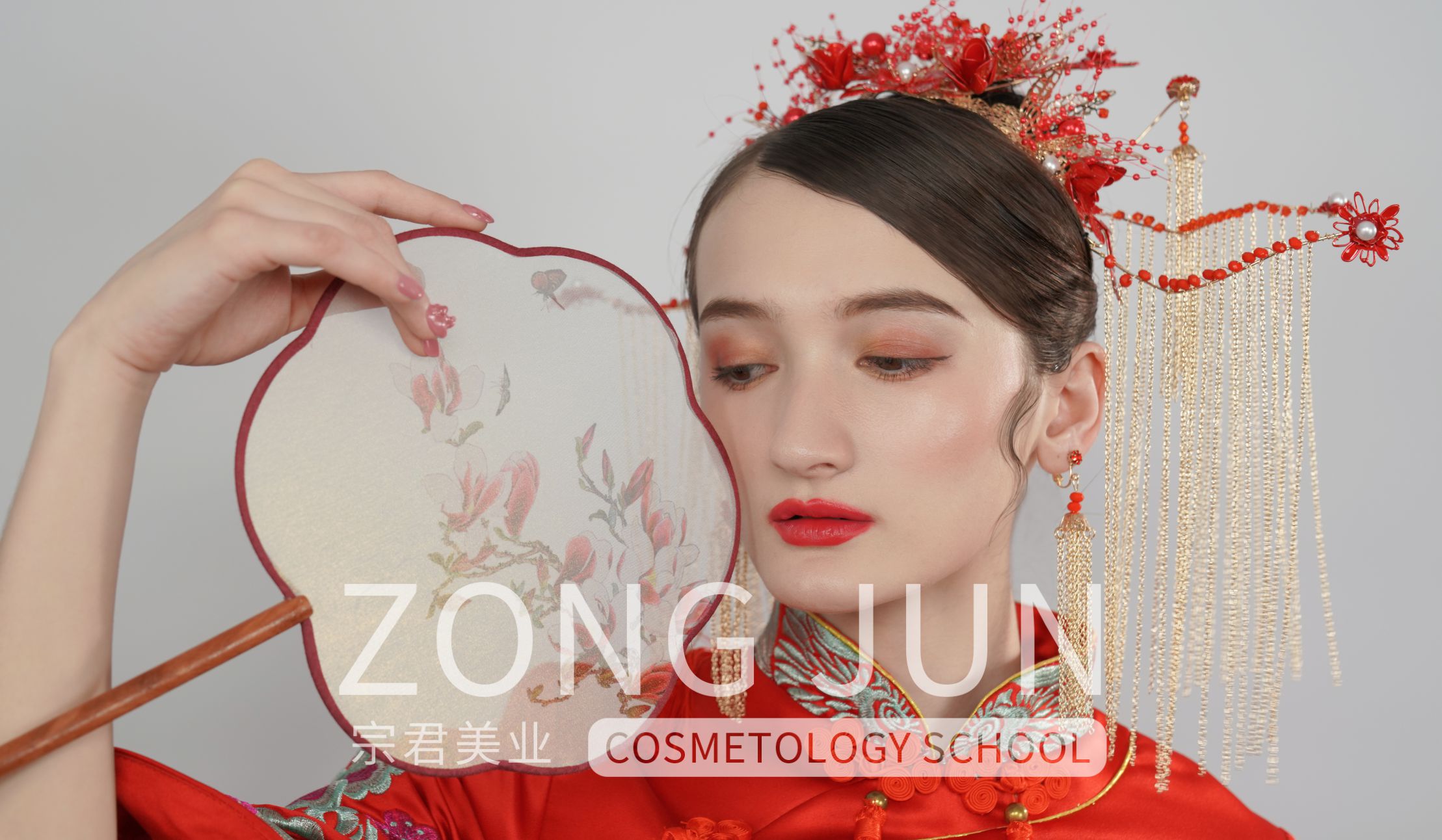 本妆容在中式红装的基础上,做了一些改良,眼影、腮红选择了更为现代时尚的色彩搭配。庄重的头饰和耳饰,增加了整体妆容的正式感。